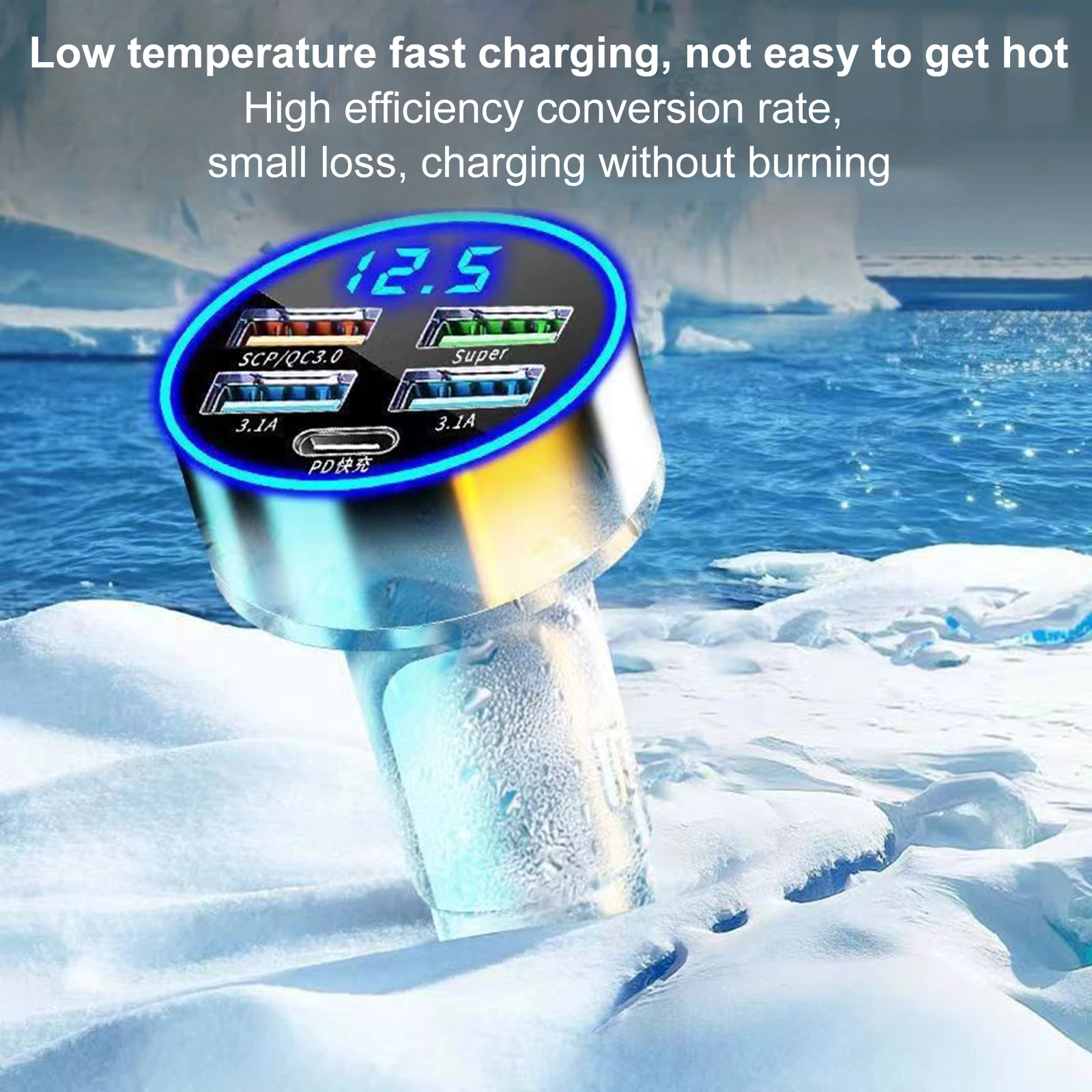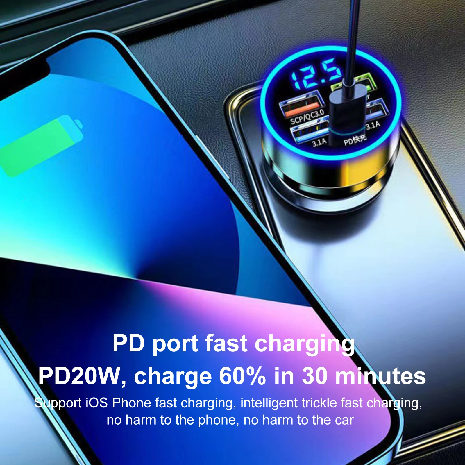 -One car charger is enough: Five-port expansion, intelligent shunt, USB port*4-PD*1. PD20W, charge 60% in 30 minutes, support iOS Phone fast charging, intelligent trickle fast charging, no harm to the phone, no harm to the car.